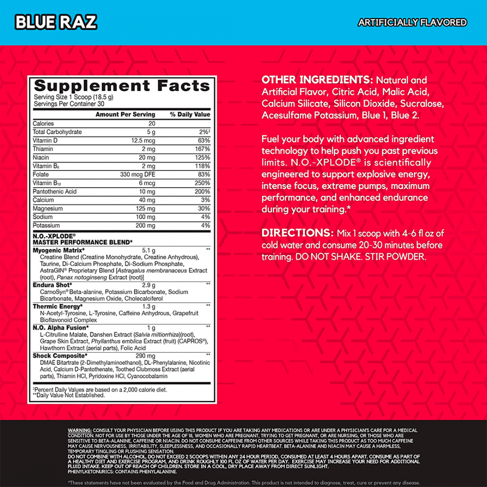 Тренируйтесь с помощью N.O.-XPLODE, легендарной предтренировочной формулы, которая помогает спортсменам привлекать внимание в тренажерном зале и вне его. Благодаря взрывной энергии, концентрации и удивительному вкусу N.O.-XPLODE вы получаете максимальный результат. Взывайте на себя взгляды.