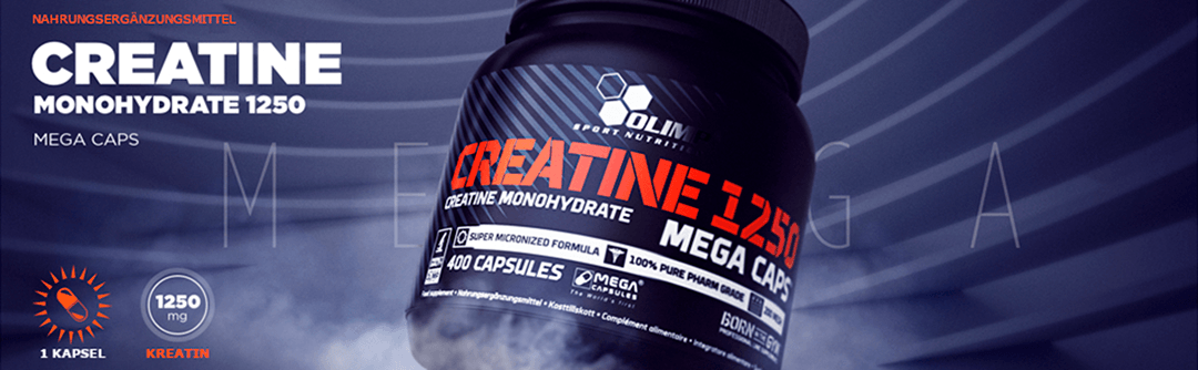 Моногідрат креатину Creatine 1250 Mega Caps / Виробник Olimp Sport Nutrition / Країна походження Німеччина-Польща / Кількість капсул 400 / Кількість порцій 133 / Капсул на порцію 3 / На 1 порцію 3,75 г моногідрату креатину