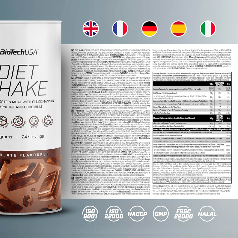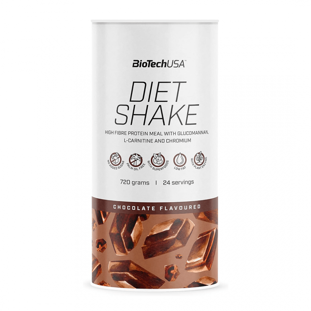 Сироватковий протеїн Diet Shake / Виробник BioTechUSA / Країна походження Угорщина / Вага 720 г / Смак Chocolate - Шоколад / Кількість порцій 24 / Розмір порції 30 / На 1 порцію 15 г білків, 2.4 г жирів, 4.3 г вуглеводів, 4.7 г клітковини / Форма виготовлення порошок